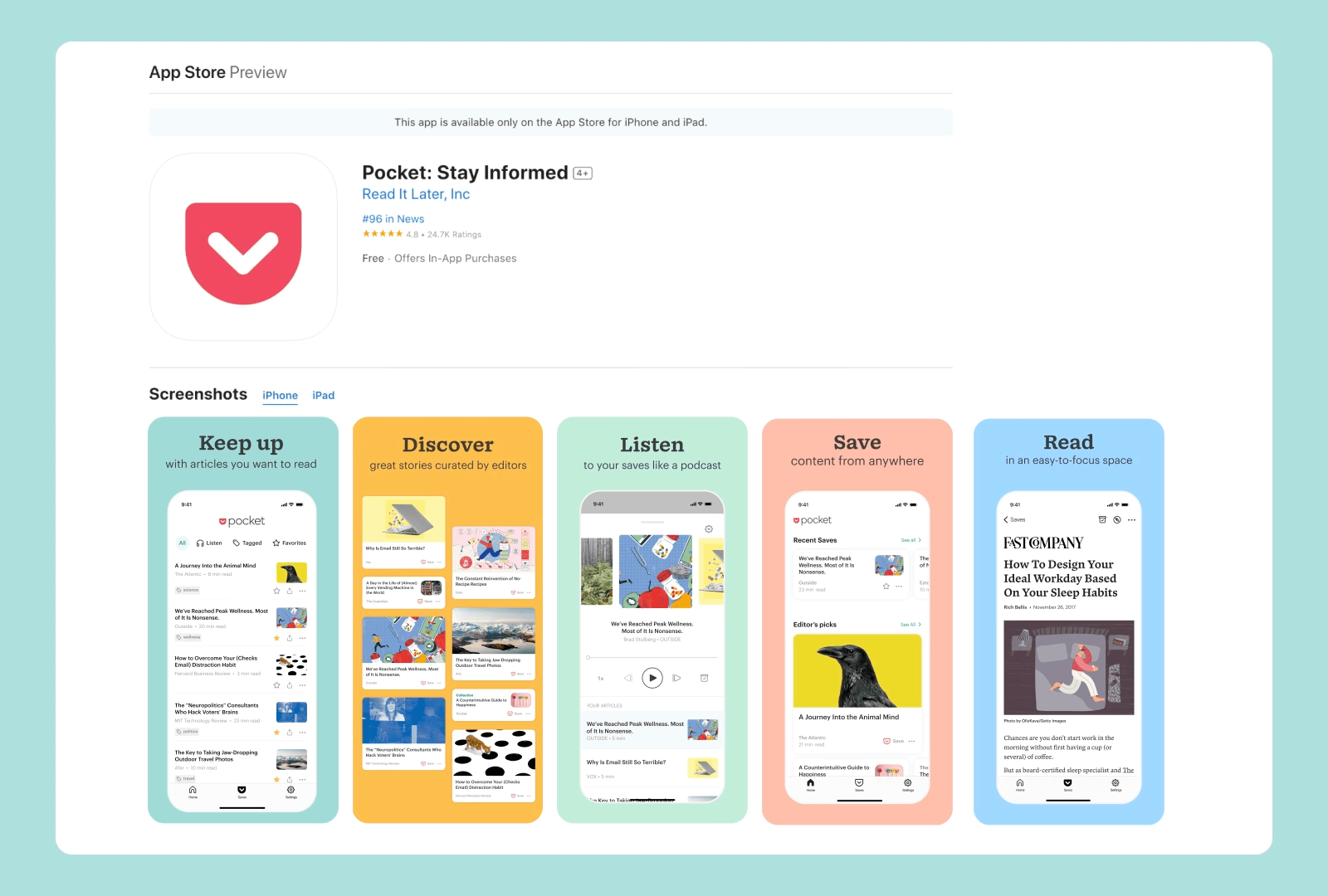 With the refresh of the Pocket brand experience coming together, the app store and brand experience needed to align.