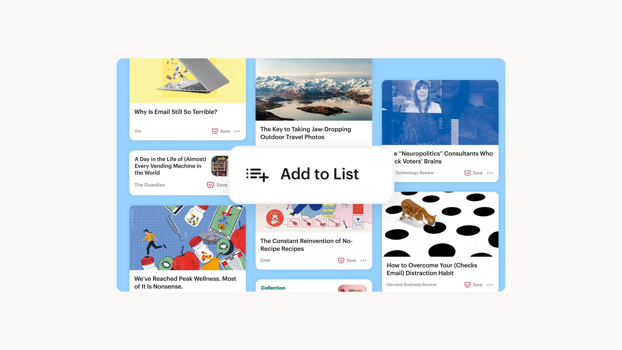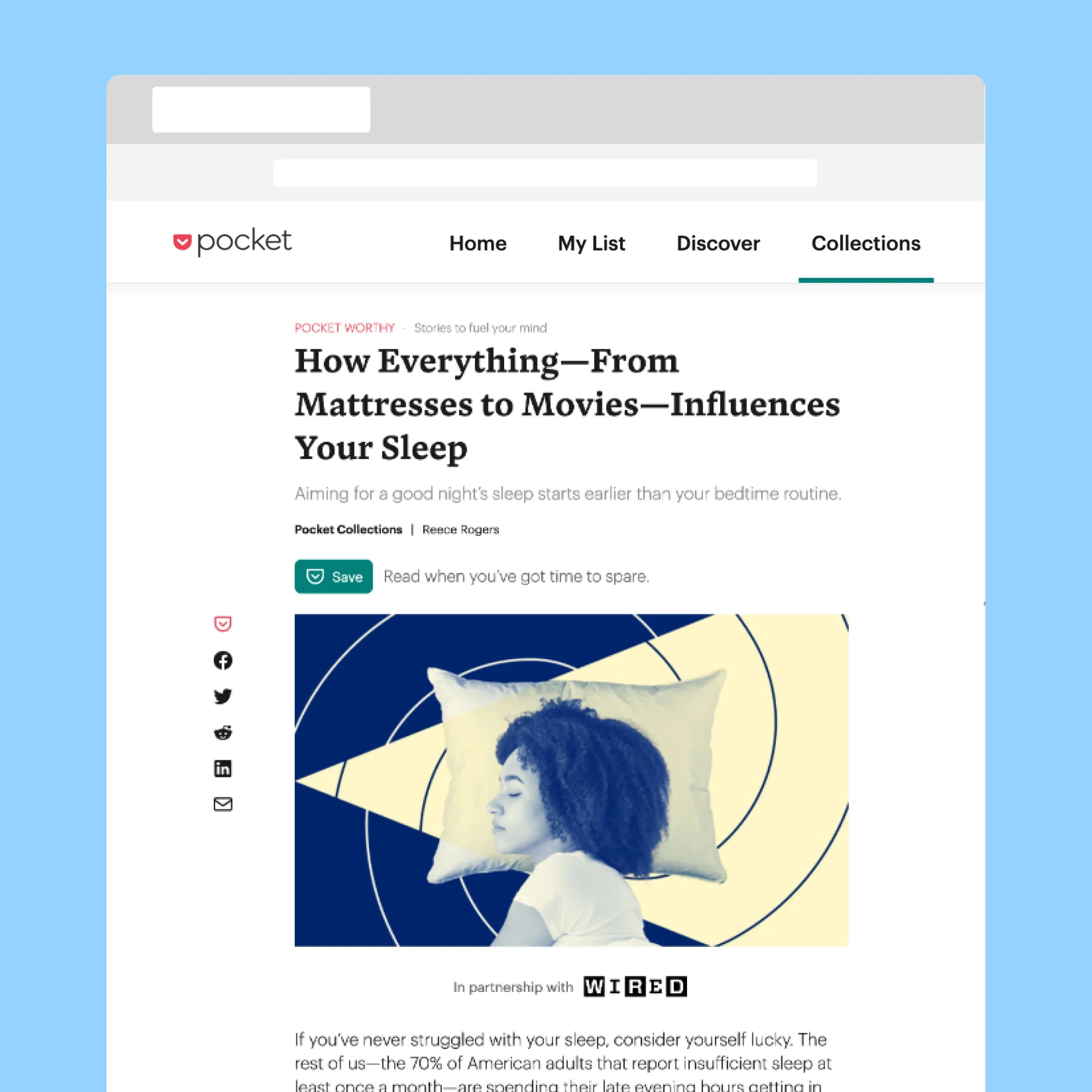 In partnership with brands like WIRED, VOX and Context, Pocket creates guides and collections curated by guests from each partner around various topics.