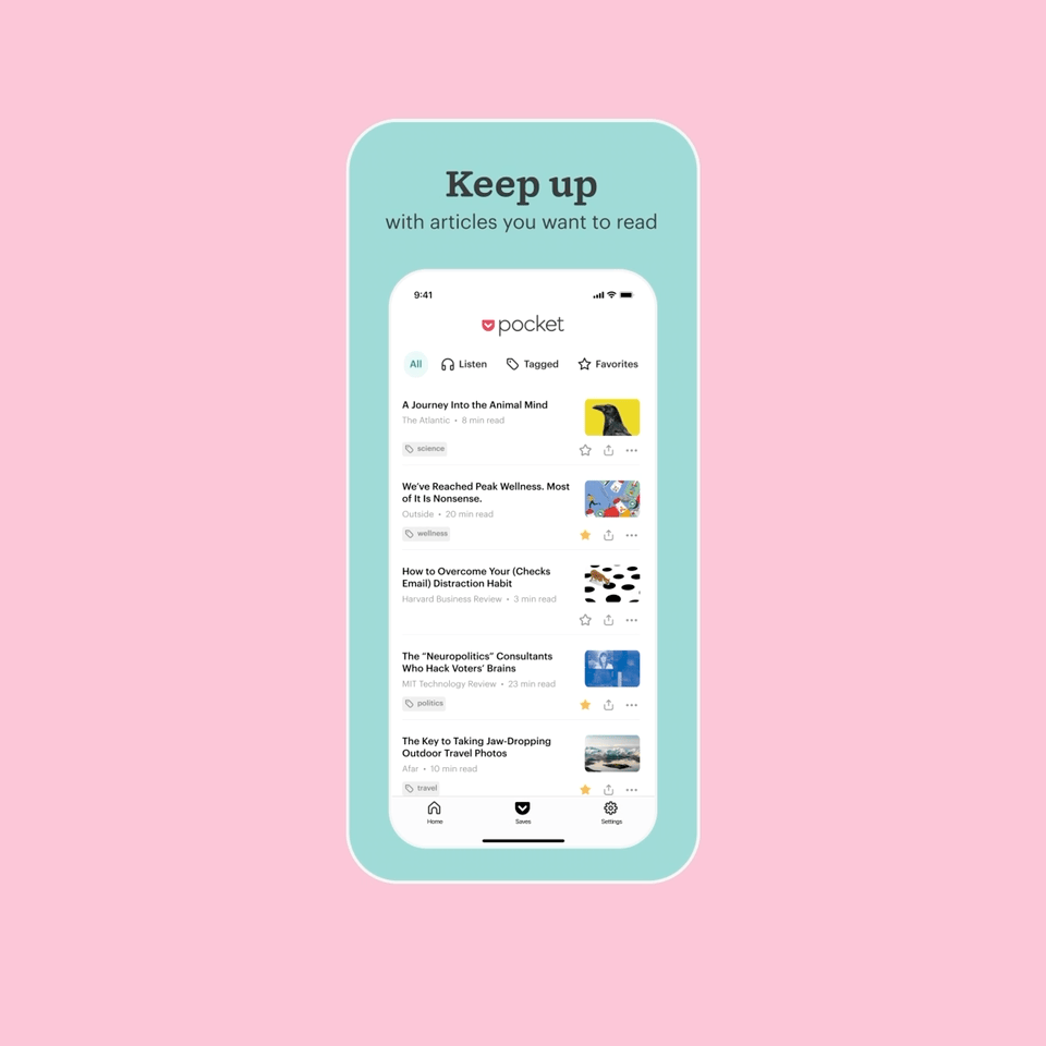 Pocket is the personalized news app that delivers quality content in an uncluttered space. It lets you save articles, websites and content from anywhere.